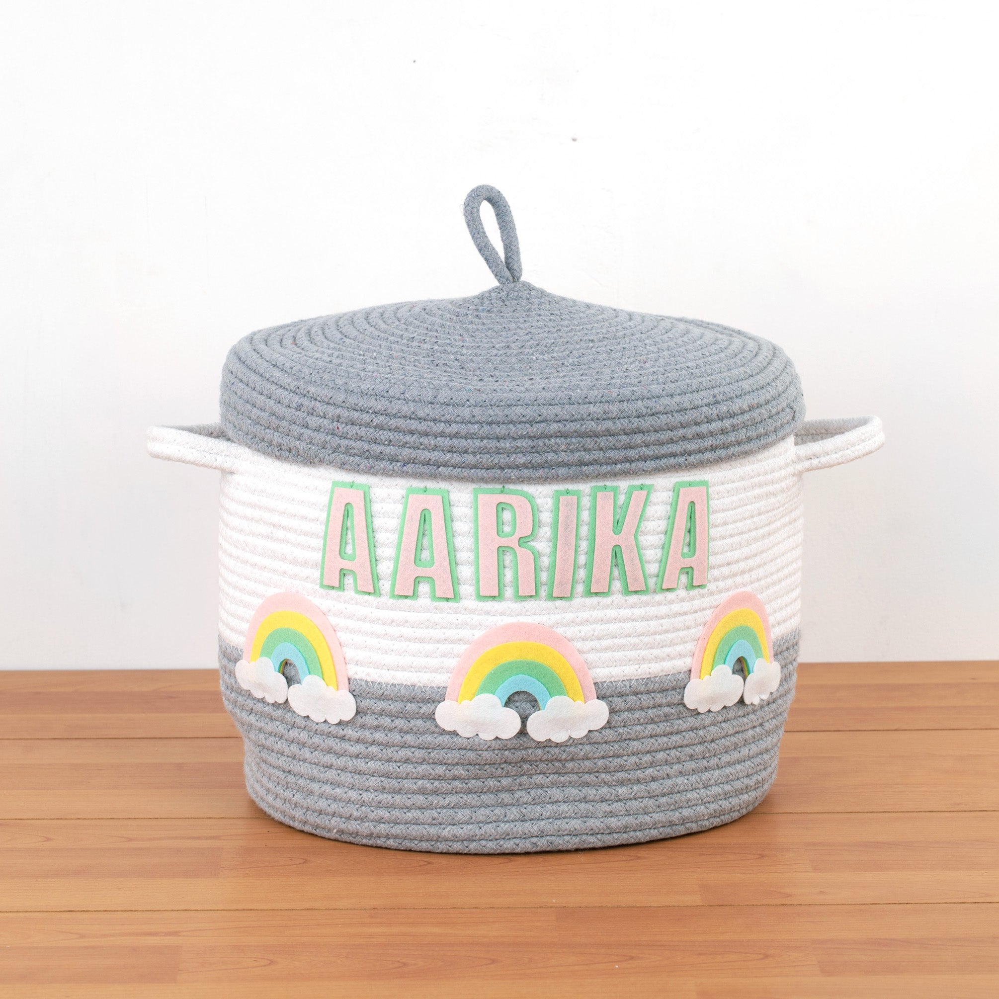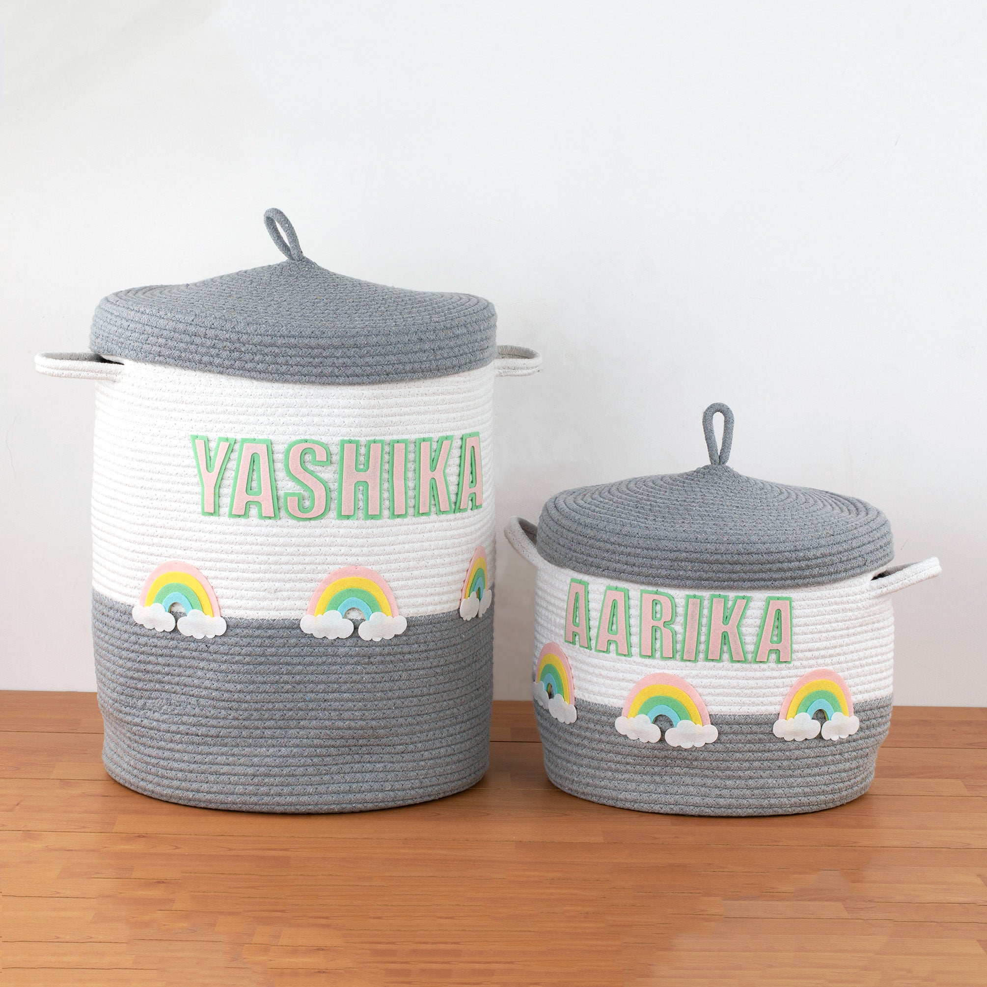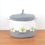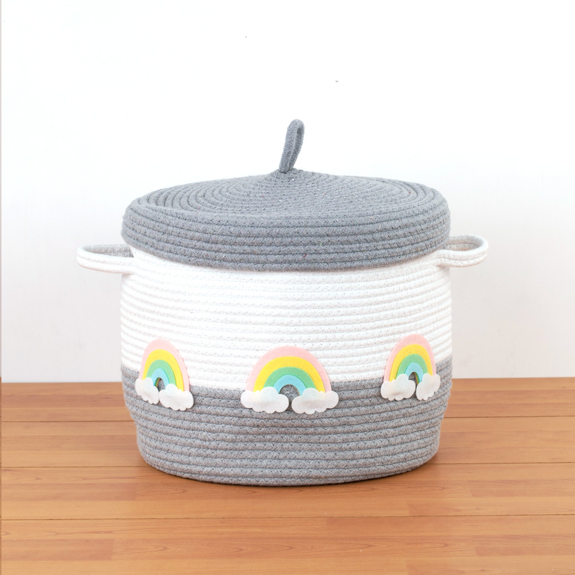 Elevate your little ones nursery and playroom organization with our soft. sturdy. and durable cotton rope storage baskets. now featuring a convenient lid. This chic. neutral design complements any nursery decor. Handmade from premium cotton rope and adorned with felt rainbow cutouts. these baskets are both stylish and functional.