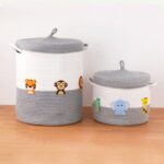 Elevate your little ones nursery and playroom organisation with our soft. sturdy. and durable cotton rope storage baskets. now featuring a convenient lid. This chic. neutral design complements any nursery decor. Handmade from premium cotton rope and adorned with felt animal cutouts. these baskets are both stylish and functional.